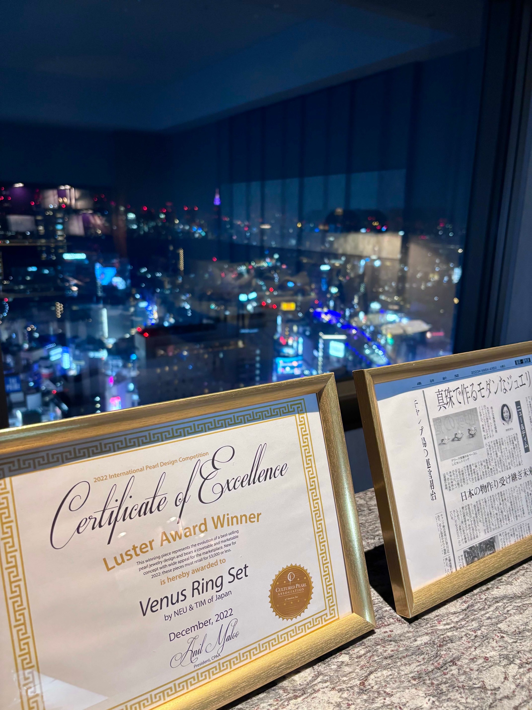 夜景を背景に飾ったゴールドの額物には、アワード受賞証や新聞掲載記事を展示。ブランドの歴史も自然に感じていただけるよう工夫しました。