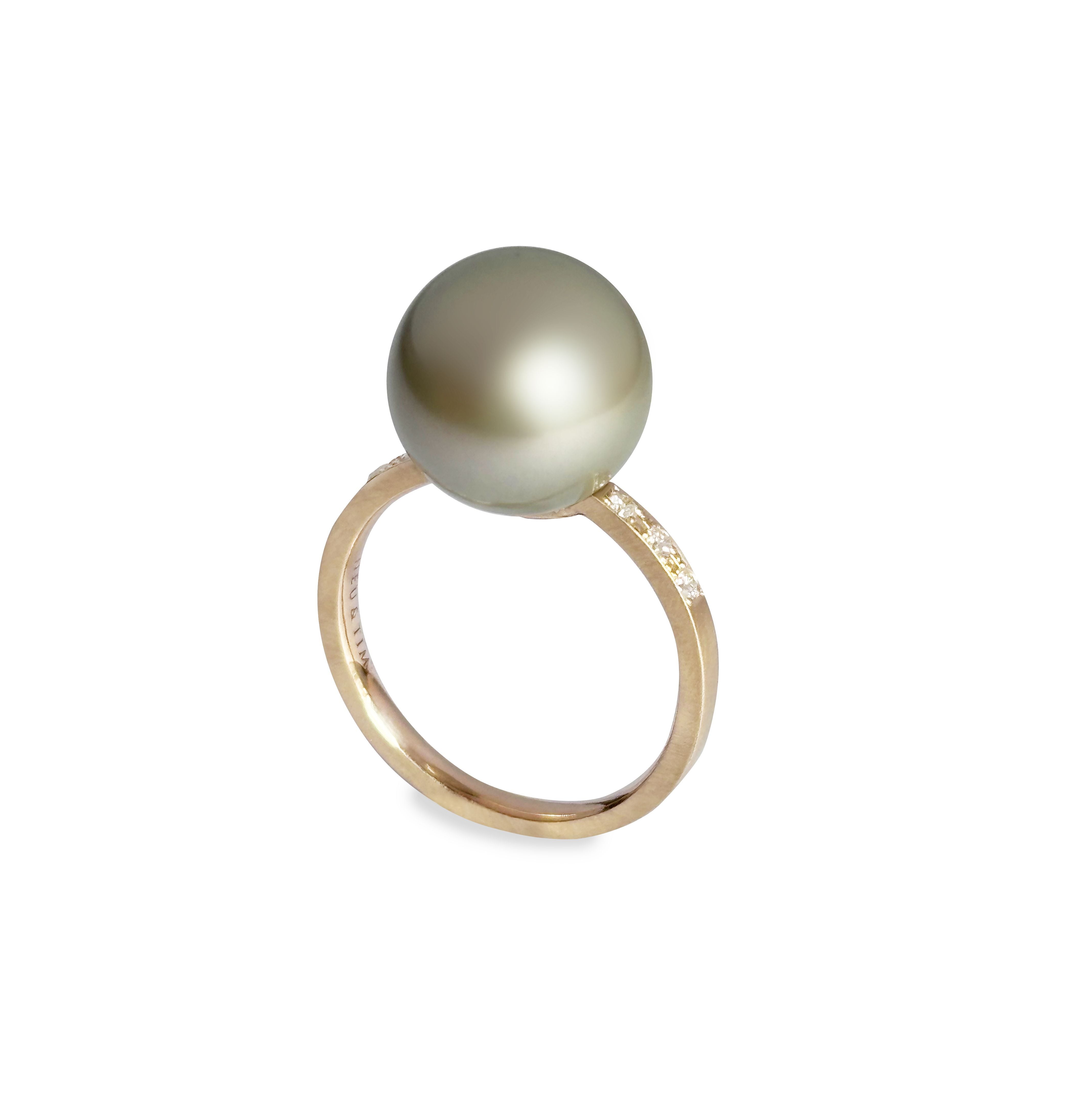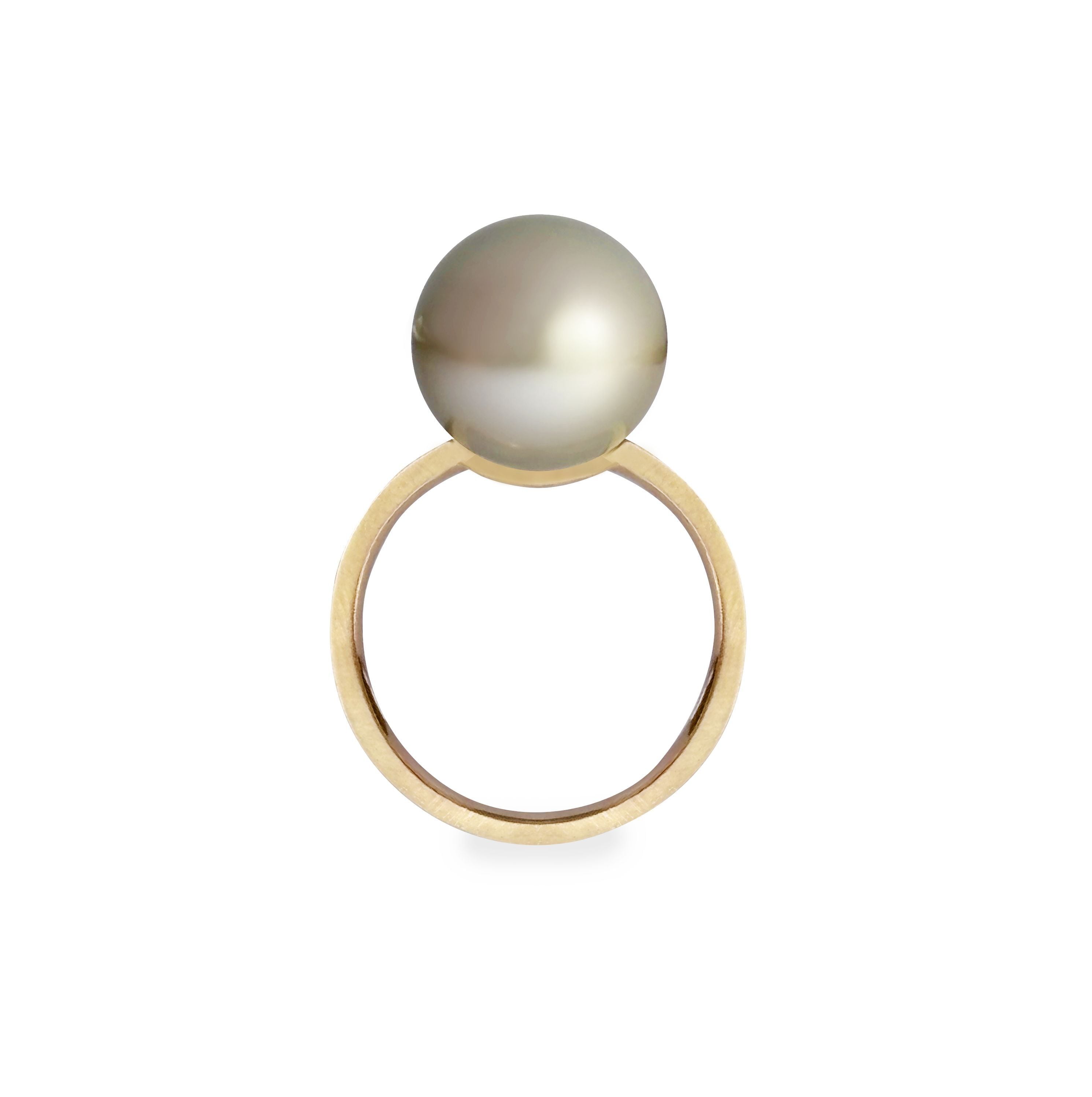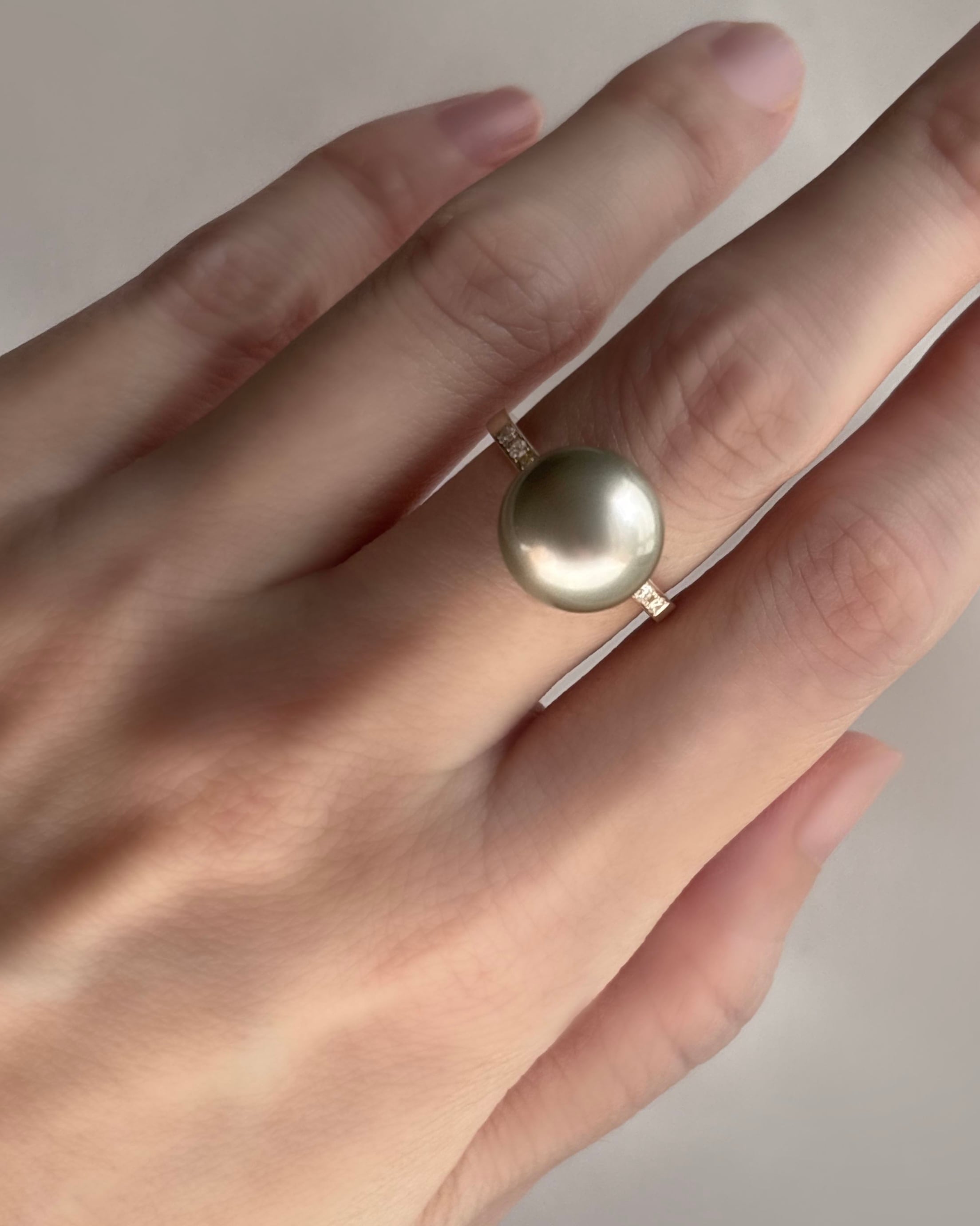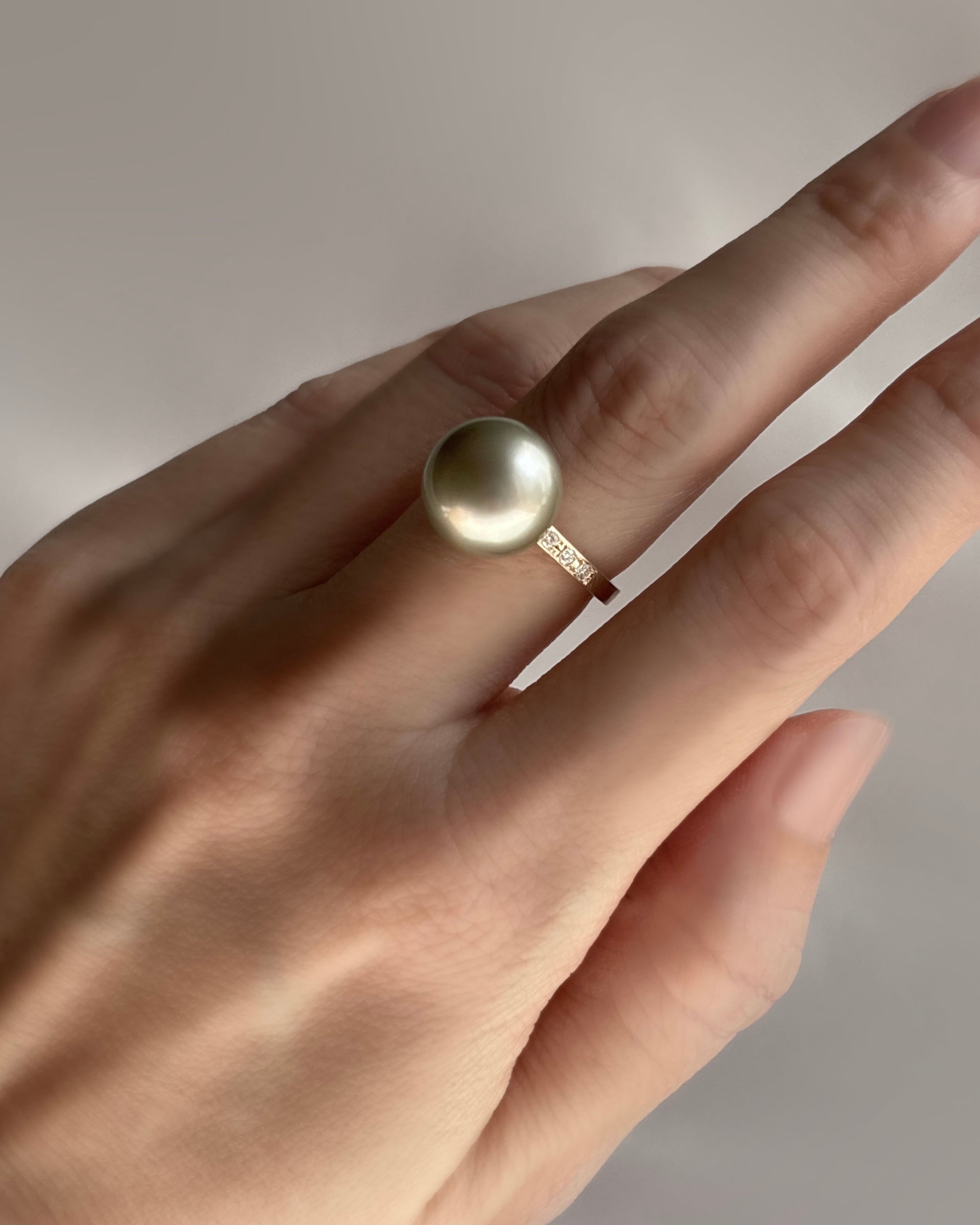 マット仕上げのイエローゴールドに、淡いグリーングレー系の黒蝶真珠を一粒あしらったリングです。