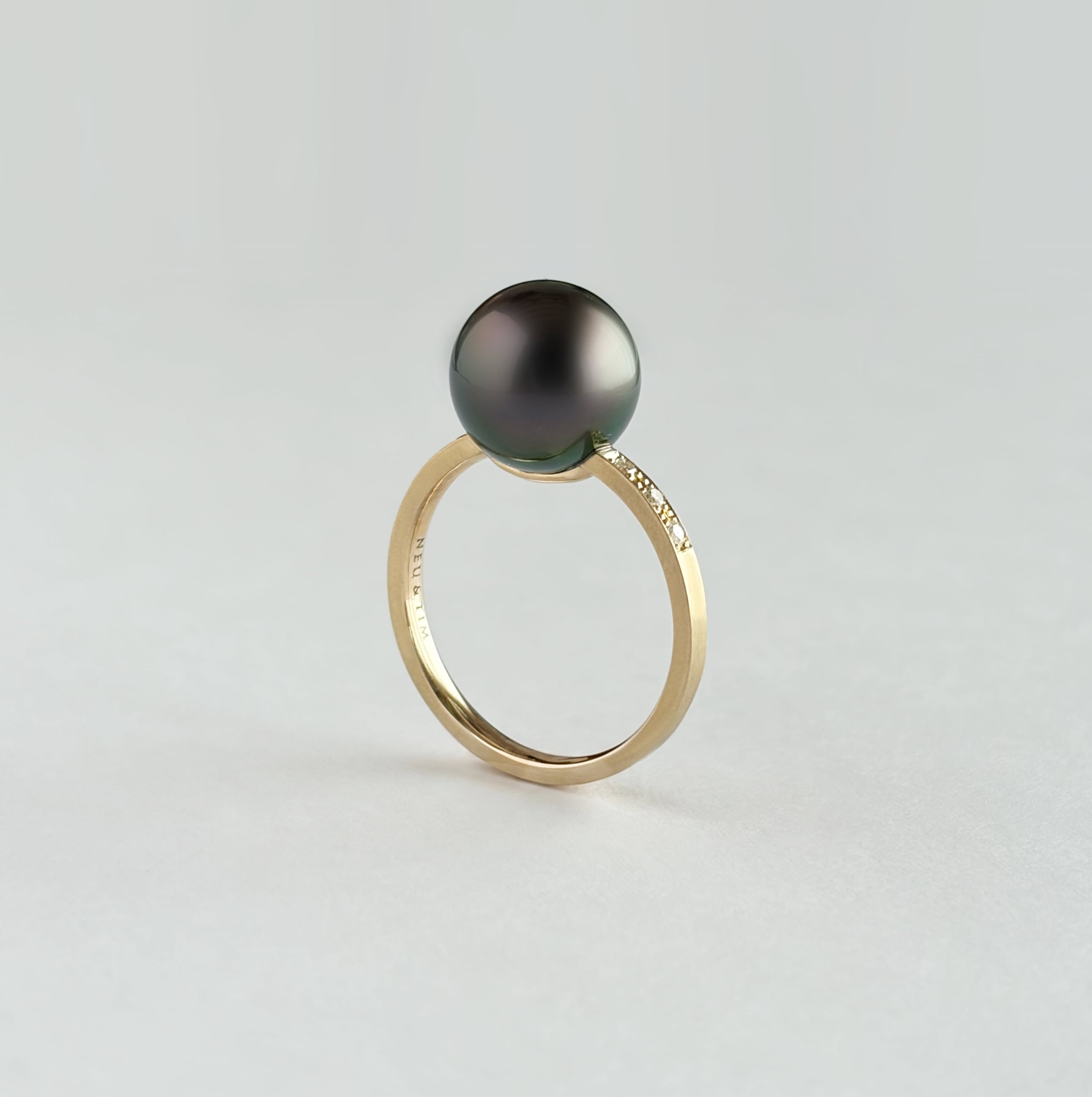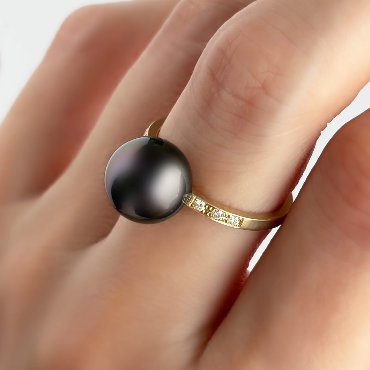 マット仕上げのイエローゴールドに、黒蝶真珠を一粒あしらったリングです。