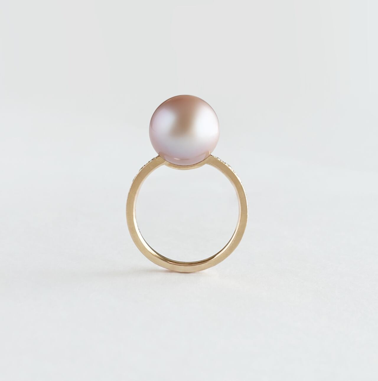 マット仕上げのイエローゴールドに、淡水真珠を一粒あしらったリングです。
