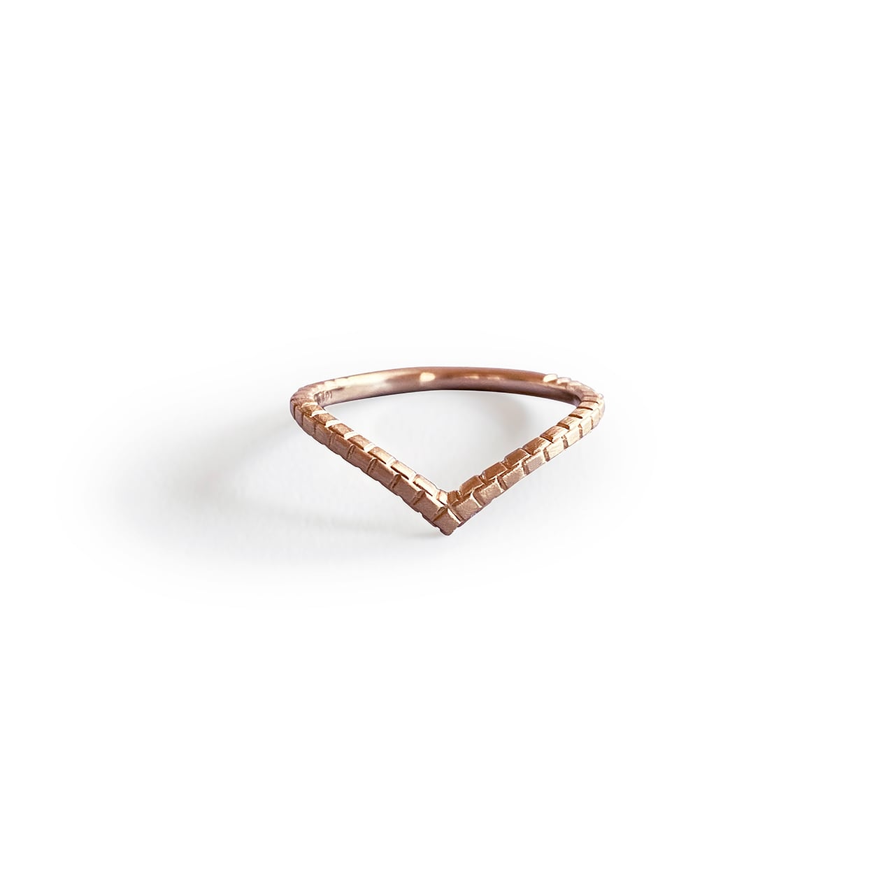 リングはマット仕上げのK10イエローゴールド/またはピンクゴールドを使用。表面とサイドにチェーンのデザインがされています。年齢やシーンを問わずに身につけやすいVラインのリング。[写真:1枚目イエローゴールド、2枚目ピンクゴールド、6・7枚目重ねづけサンプル]