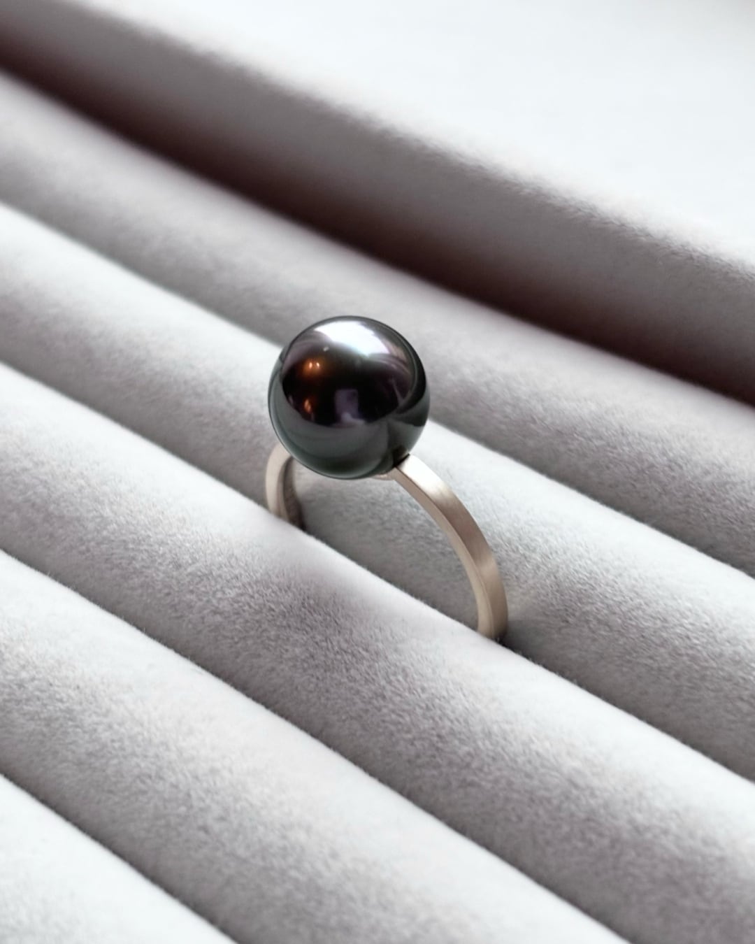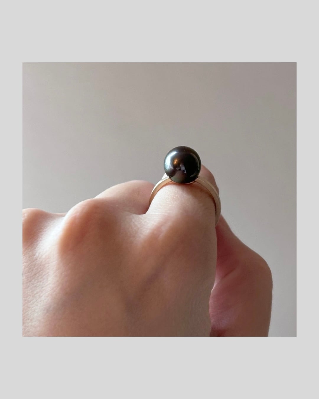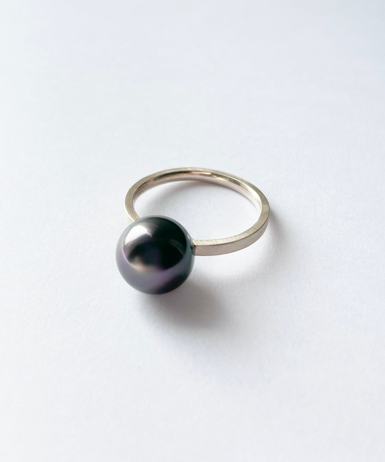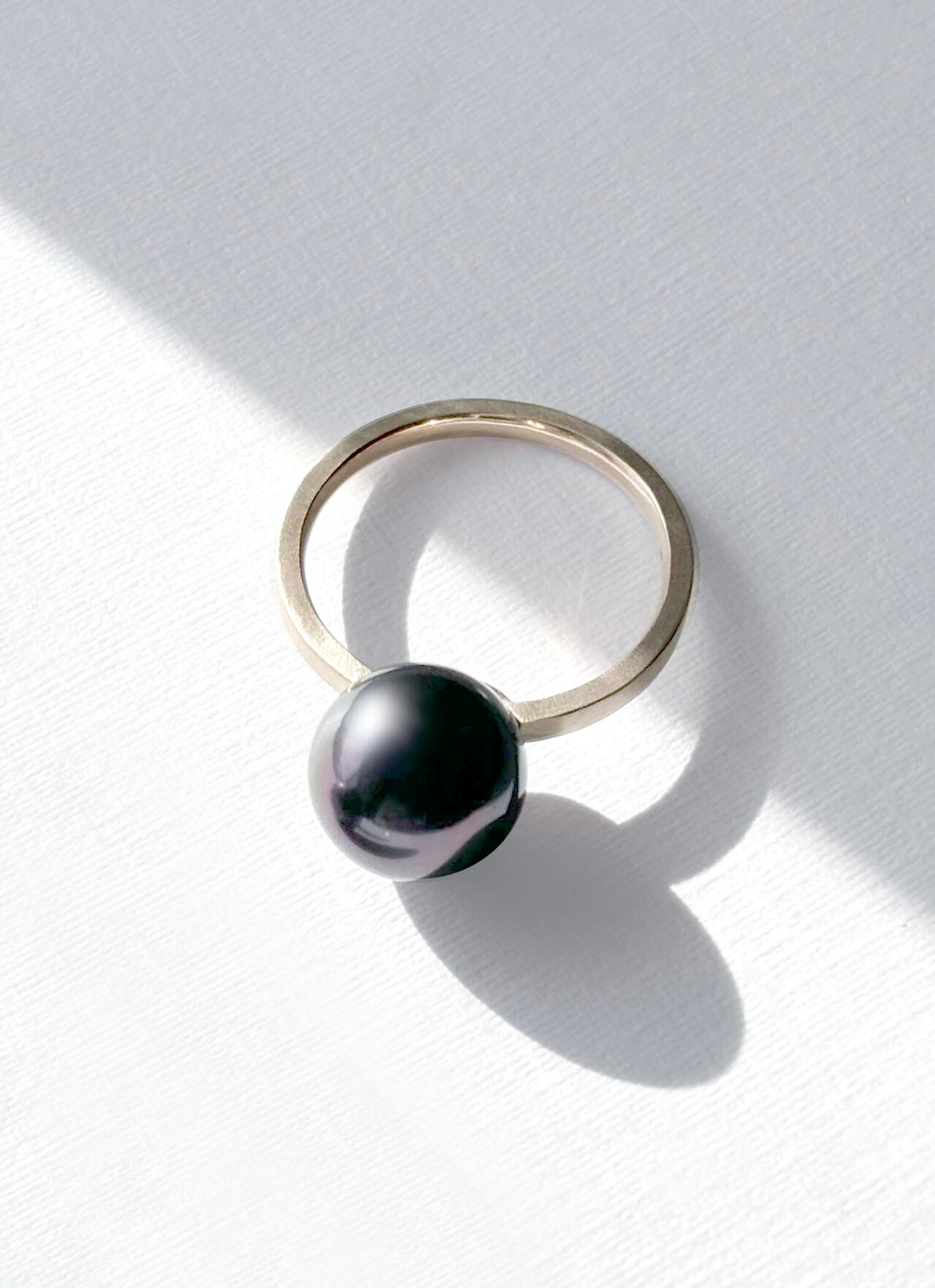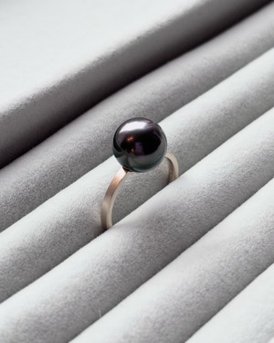 リングはマット仕上げのK10イエローゴールド。リングはクロチョウ真珠1ピースがセットされています。厳選した真珠の美しさ、クラフツマンシップが光ります。(画像2,3枚目: 地金リングは別売りです)